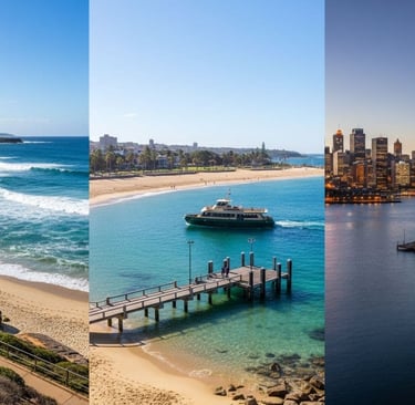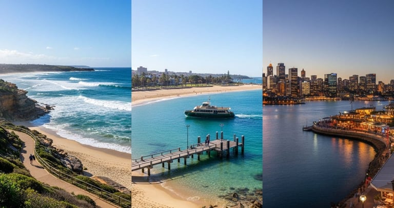 Collage of Sydney's beaches and waterfront: Bondi Beach with ocean waves and coastal path, Manly Beach sandy shore and ferry dock, Darling Harbour evening waterfront restaurants; vibrant sunny weather, natural photo style, minimal distant people.